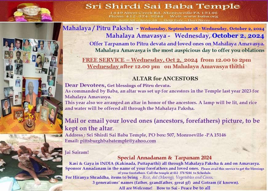 As commanded by Baba, an altar was set up for ancestors in the Temple last year 2023 for Mahalaya Amavasya.